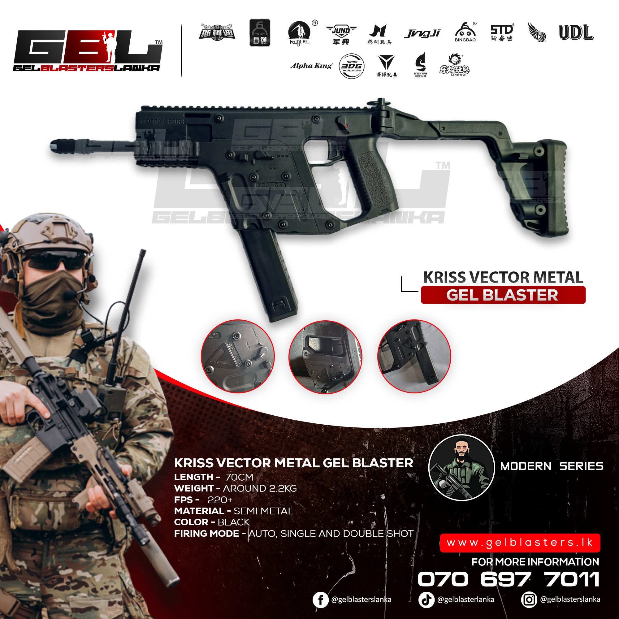 Experience realistic design and solid performance with the Kriss Vector Gel Blaster, built at a true 1:1 scale for an authentic look and feel. Featuring a durable high-quality nylon body paired with a metal gearbox, this gel blaster delivers reliable operation and long-lasting durability.With a weight of around 2.2kg and a length of 70cm, it offers a well-balanced, realistic handling experience. The blaster supports multiple firing modes, including auto, single, and double shot, allowing for versatile play styles. Achieving 220+ FPS, it provides consistent and responsive performance suitable for recreational gel blasting.
